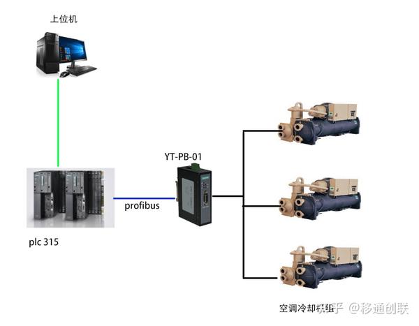 PLC通过移通创联的MODBUS转PROFIBUS网关YT-PB-01对若干台空调机组的重要运行数据(包括蒸发器压力和温度、冷凝器器压力和温度、电流、电压、冷凝供水温度、机组状态、报警以及设备的启动和停止)进行监控。