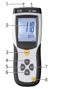 CEM华盛昌厂家直销专业差压计USB数字式记录分析 DT-8890 .超大液晶背光双显示屏. 数据保持. *大值/*小值/平均值并带相对时间. 可选择的USB软件. 调零,偏移和数据补偿功能. 低电池显示和自动关机 CEM华盛昌厂家直销专业差压计USB数字式记录分析 DT-8890