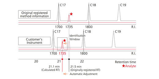 因为所有的化合物保留指数已被预先注册,GCMSsolution的AART (保留时间自动调整)功能使用户可以轻松修正保留时间,从而使分析更加方便和顺畅。 *要使用AART功能,另需正构烷烃混合溶液。