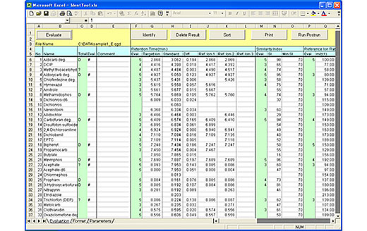鉴定结果可以按组分存在可能性以从高到低的顺序显示。该工具与GCMSsolution兼容,因此可以对实际样品中的组分鉴定进行仔细研究。 使用该方法包中的鉴定工具时,须使用微软的EXCEL软件。