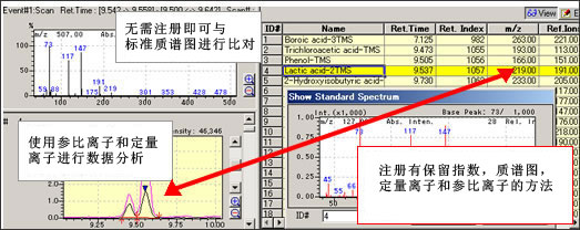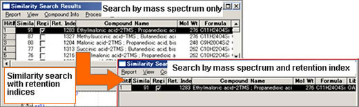 例如,因为有机酸TMS衍生物的质谱图极为相似,如果只用质谱图进行检索,会得到70多个候选化合物。但如果利用带保留指数的相似度检索,结果只有一个符合条件的候选化合物。