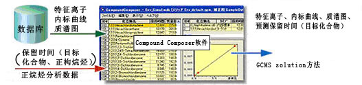 Compound Composer快速筛查数据库汇集目标离子、质谱图、内标曲线和定量所需其它信息,并生成GCMSspution方法文件。同时通过数据库中的正构烷烃保留时间和当前仪器条件下分析获得的正构烷烃保留时间预测化合物的当前保留时间,从而能够使用GCMSspution进行鉴定和半定量工作而无需规定其它条件。除此之外,验证仪器性能的化合物信息也注册在数据库中。请参考使用Compound Composer快速筛查数据库进行GCMS同步分析的流程图。