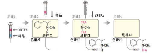 1、MBTFA (N-甲基二(三氟乙酰胺)) 衍生剂以及待分析的样品溶液被吸入到进样针中。 2、进样,在进样口处挥发并导入进色谱柱入口端。 3、待分析的组分进入色谱柱后,注射MBTFA衍生剂。 4、待分析的组分在色谱柱中衍生,然后衍生物进行GC/MS分析。