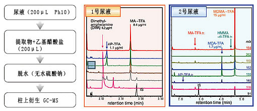 尿样处理如下图所示。从1号尿样中测出*****(MA)的TFA衍生物及其代谢物苯异丙胺(AP)。从2号尿样中测出MDMA及其代谢物MDA、HMMA的TFA衍生物以及*****和苯异丙胺的痕量TFA衍生物。通过该项技术,衍生化的过程被简化,分析效率得到提高;而且,苯异丙胺、*****及其类似组分以更高的灵敏度被检测出来。