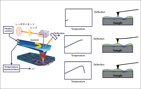 测定方法是使nano热探针与样品接触,探针的前端达到一定的温度后,样品表面发生相应的膨胀、软化或者热变化,对由此引起的探针的上下位移(TMA)进行测定。另外可以在nano热探针加热的同时获得样品表面的扫描图像。(Heated Tip AFM)
